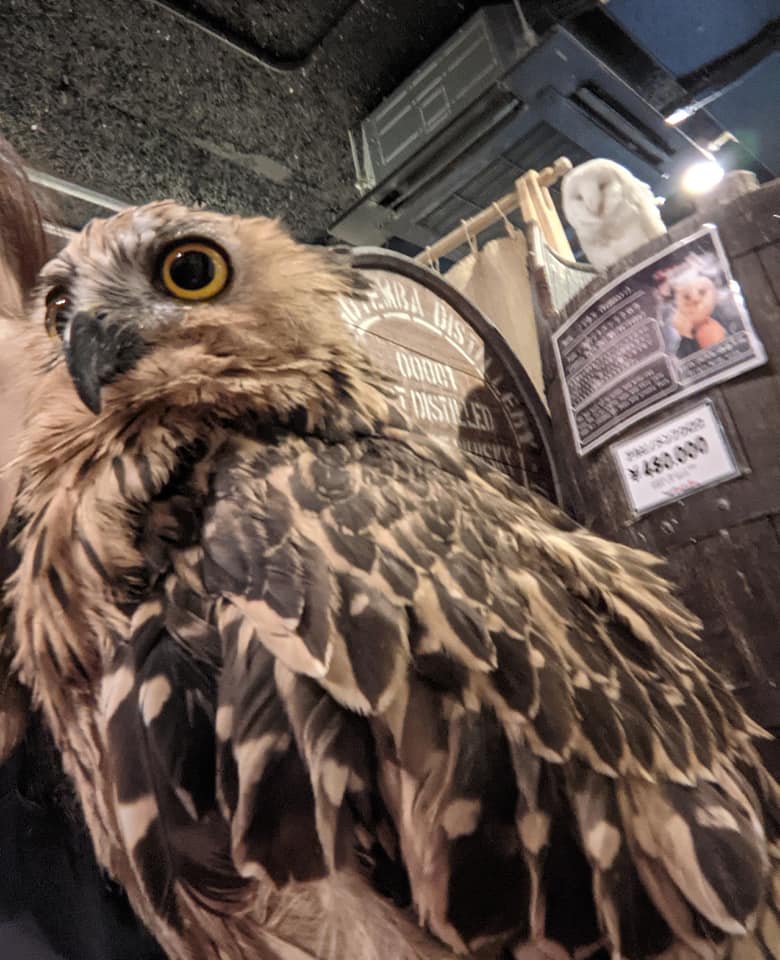 フクロウの中では珍しく、魚も捕食するマレーウオミミズクの鯱丸くん。