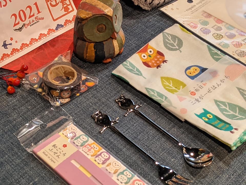 ①ふくろうがまぐち(アビシニアンワシミミズク)②幸せを呼ぶフクロウの羽入りフォトスタンド③ぬいぐるみ④木の置物⑤ハンカチ⑥ケーキフォーク⑦ティスプーン⑧付箋⑨シール⑩マスキングテープ⑪ステッカー⑫ラッピングペーパー