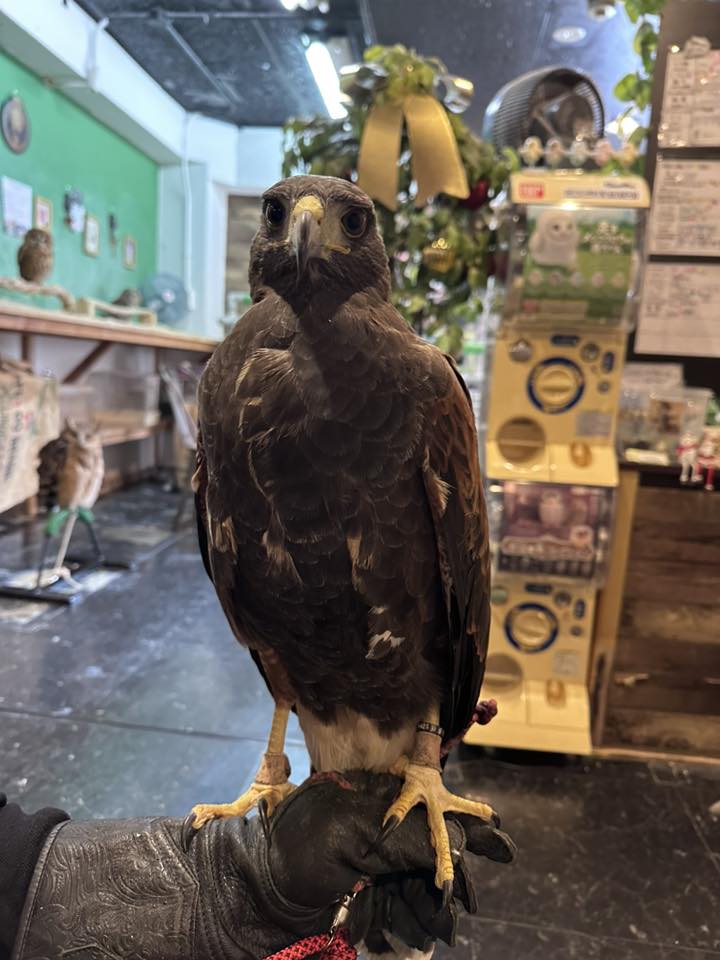 ハリスホークは空飛ぶ犬と例えられ、フクロウが猫のような性質なのに対し、ハリスホークは非常に飼い主になつき、複数人とも仲良くできるのが特徴。ペットにも向いています。